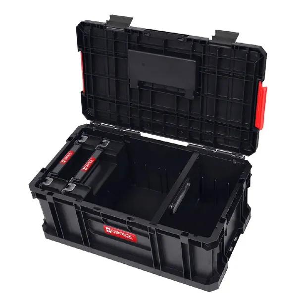 Modularna, wytrzymała skrzynka narzędziowa z poliamidowymi zapięciami i solidną rączką.